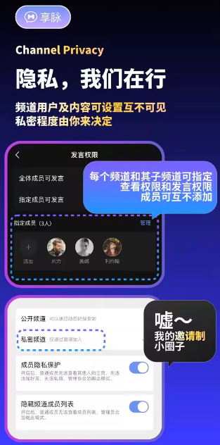 1、频道用户及内容可设置互不可见,私密程度由你来决定。