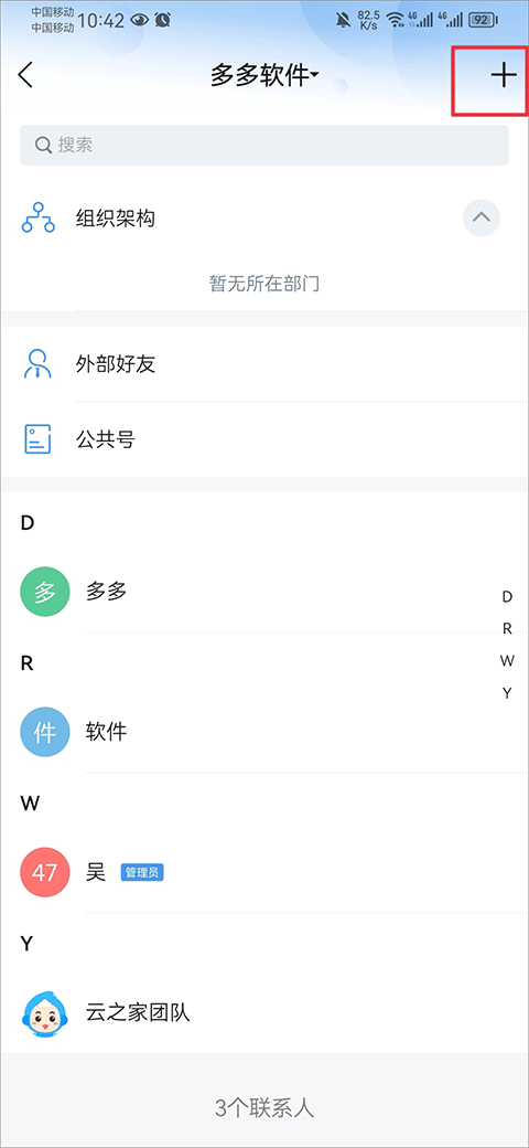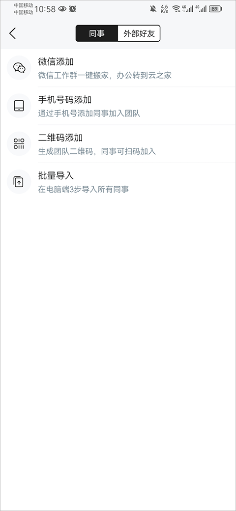 加入公司团队有4种方式,需要系统管理员操作或管理员开启【允许非管理员邀请新成员】的权限,然后在通讯录界面点击右上角的+号添加