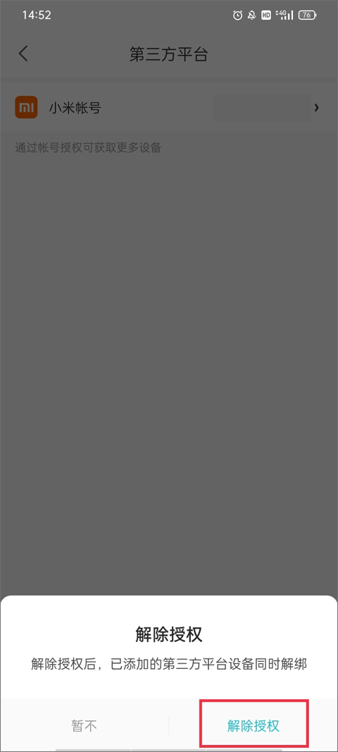 4、如何想解除授权,再次点击小米账号就会自动弹出解除授权的功能按钮,点击它就能立即解除。