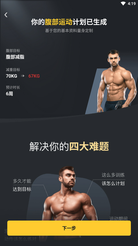 1、打开腹肌撕裂者app,用户需先填写自己的身体信息,然后系统会基于资料为你量身定制腹部运动计划;