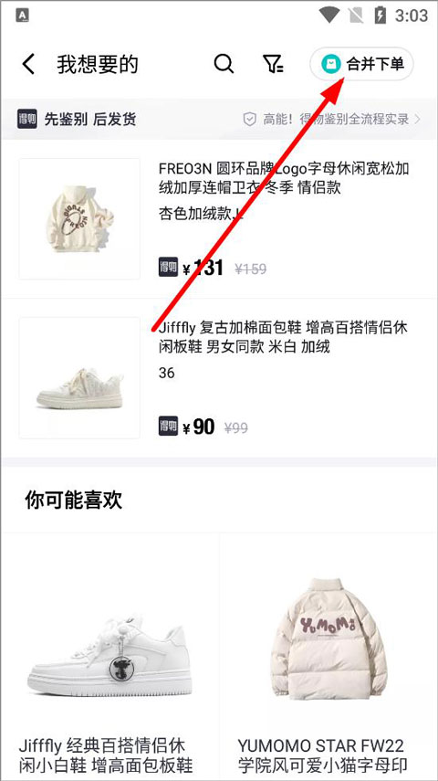 5、进入想要页面,可以看到之前添加想要的商品,点击右上角合并下单;