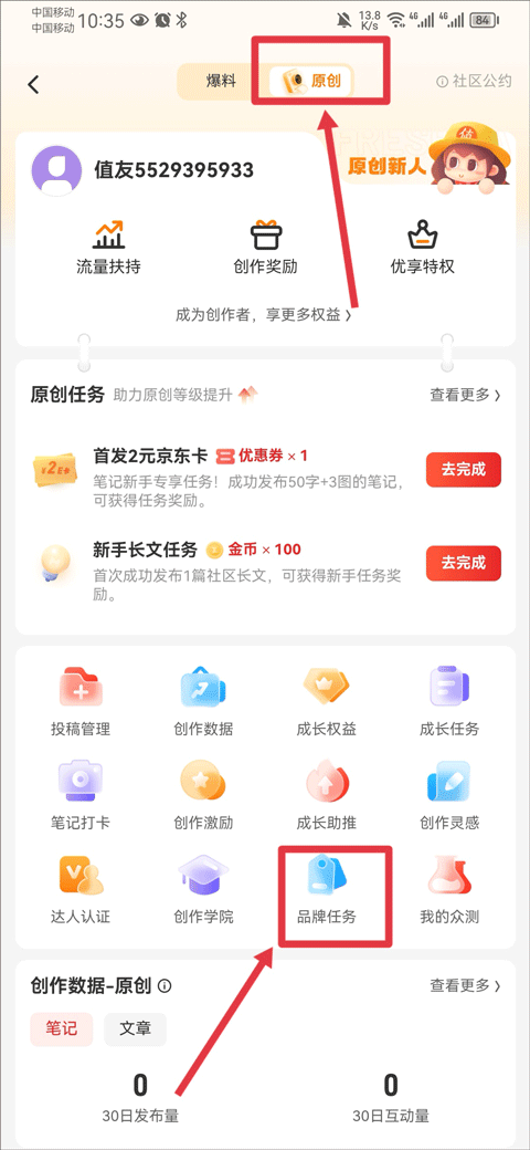 点击「我的」-「创作中心」-「原创」-「品牌任务」