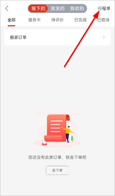 3、打开订单页面,可以看到我下的订单、我发的订单以及我收的订单,点击右上角行程单;