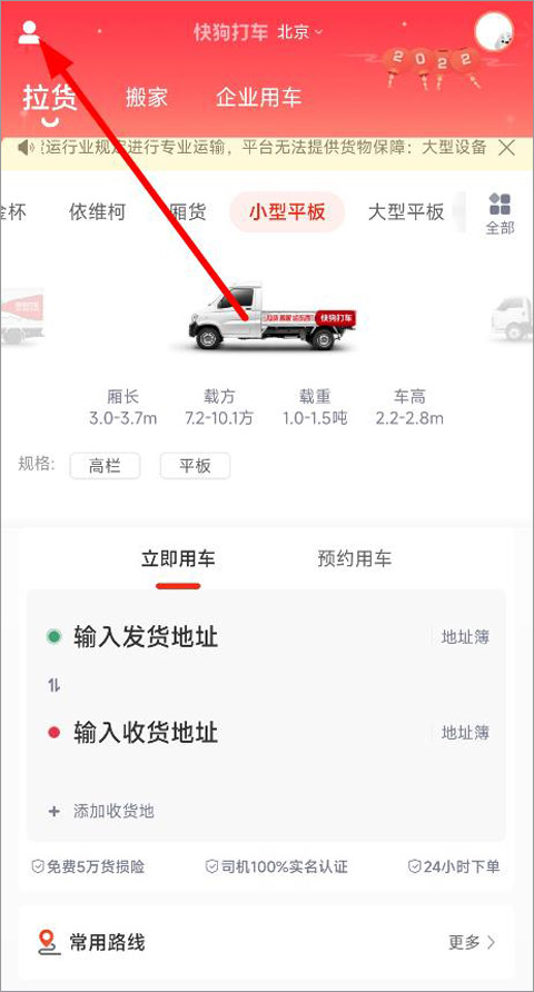 1、打开58速运app,登录账号进入首页,可以看到货运服务中的服务项目和车型选择,有拉货服务可选择面包车、厢式货车、平板车等,搬家可选择小搬、中搬、大搬、办公室搬家等,点击左上角头像;