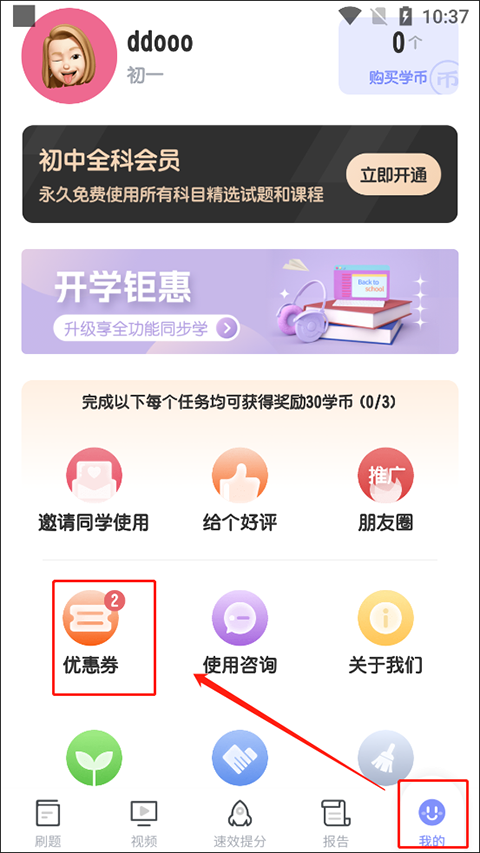 1、有些用户会问这个优惠券怎么使用呢?首先选择“我的”-“优惠券”。