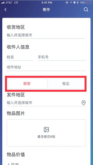3、"发布寄件"在悬浮按钮打开之后,选择"寄件","收件地区"填收件人所在的城市或地区,(收件人信息填写步骤略过)"帮带/帮买"是两种出行人可以服务的方式。其中"帮带"仅限于寄件人将现有物品转交出行人带回,只需支付帮带费,"帮买"的多数使用场景为寄件人提交某商品在该国家电商平台上的链接,出行人看到之后可以直接在该电商平台上付款下单,并寄到自己的出发地址,等待出发。