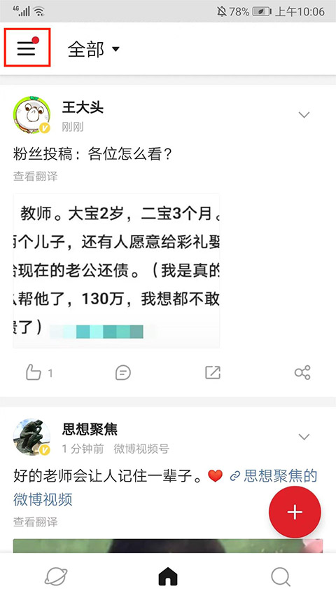 1、打开微博极速版app,点击左上角“三条横线”选项,