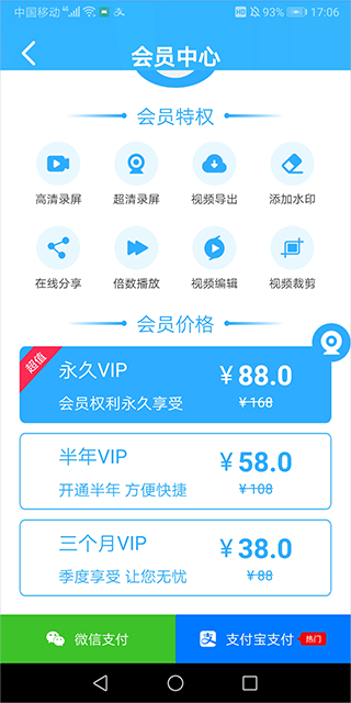 该应用的录屏功能、视频编辑功能是免费使用的,但是如果要将视频导出或分享需要开通会员,价格以页面显示为准