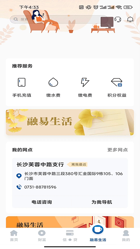 融易生活频道,为客户提供多项优惠充值及缴费服务;待办事项提醒,让客户提前知晓理财到期、贷款还款和信用卡还款等信息。