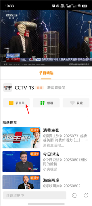 用户进入频道页面就可以开始看电视直播啦,可以在屏幕上方的分类里选择推荐、央视、卫视、电视剧等视频分类进行观看。