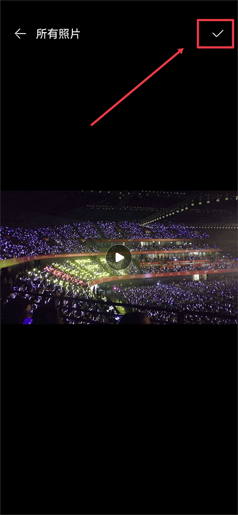 2、点击后会跳转至相册,在相册中选择你要上传的视频,选中后点击右上角勾