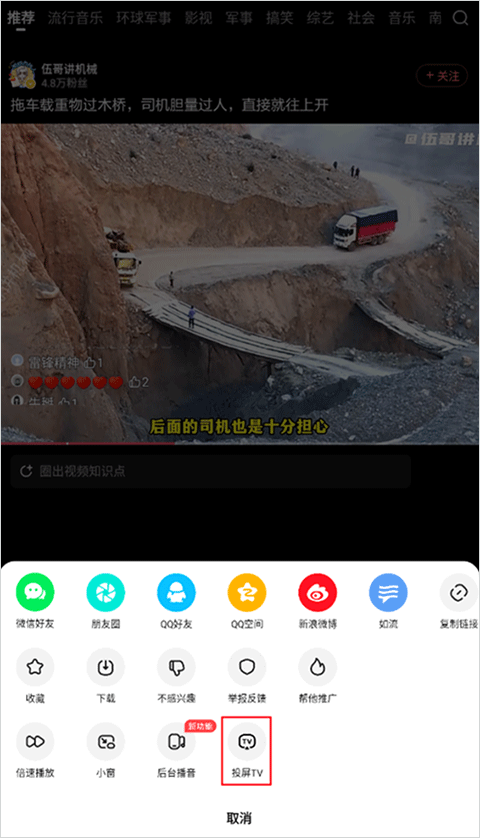 2、点击视频对应的分享图标"↗“按钮,选择投屏tv即可。