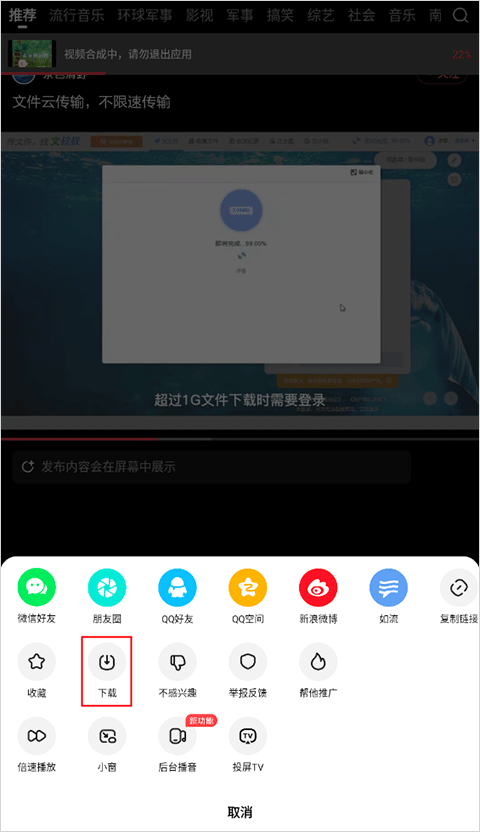 1、同样是点击视频对应的“分享”图标,在窗口中选择“下载”即可。