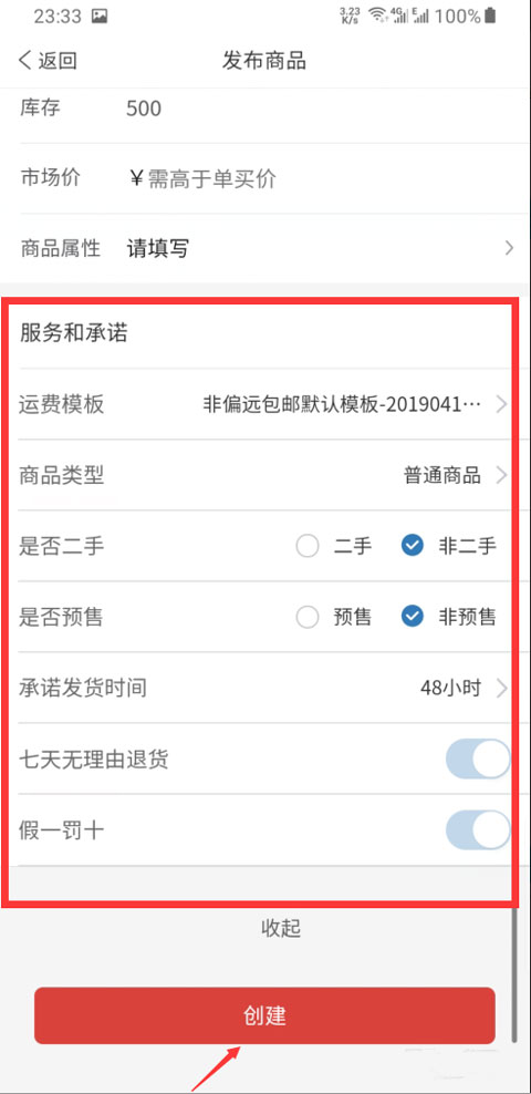 6、下拉页面到【效劳许诺】,依据本身需求编写页面中的项目,并点击【建立】即可宣布商品。