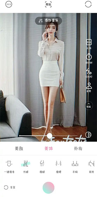 3、瘦脸瘦身:划指间一键自然修容,优化你的脸型,不要双下巴,提拉紧致瘦身,让象腿变长腿。胖妞变超模