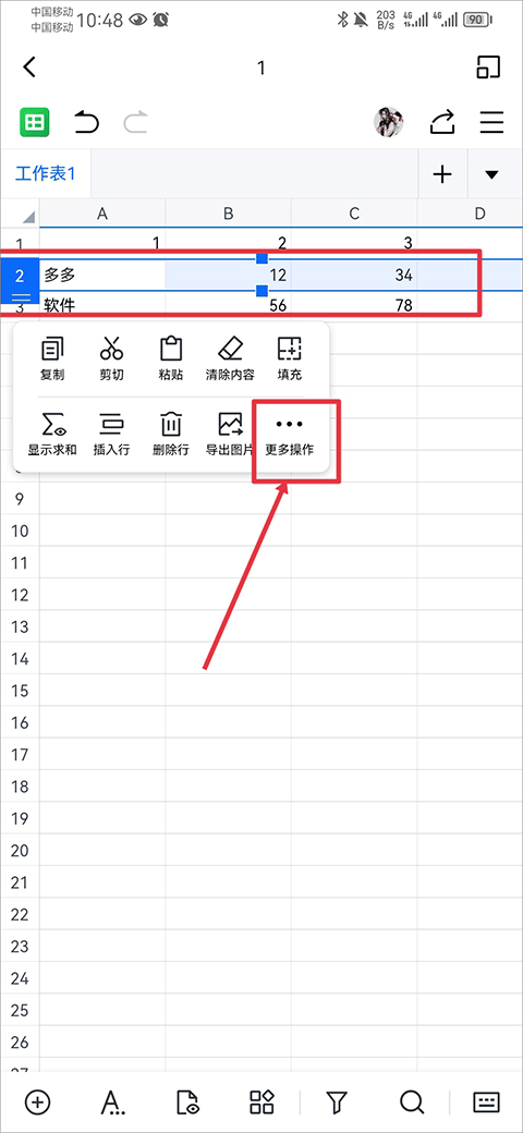 1、在表格界面中点击选中你要隐藏的行或者列,然后点击更多操作