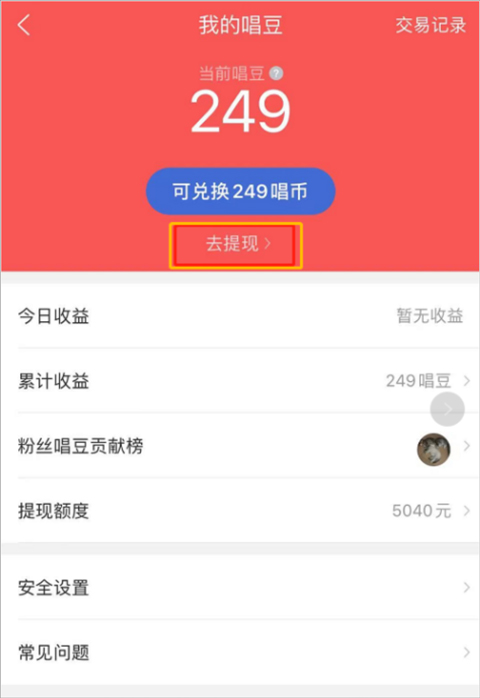 2、在“我的唱豆"页面,点击"去提现"按指示操作即可