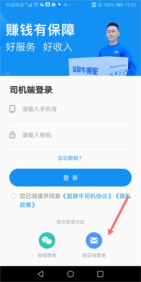 1、用户打开蓝犀牛司机端app后进入页面中点击页面底部右侧的【验证码登录】