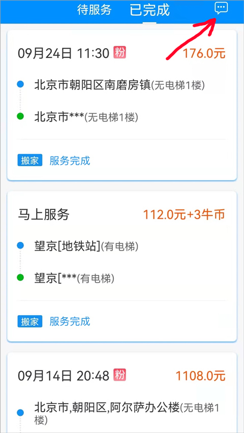 司机用户们要以打开并登录蓝犀牛搬家司机端后进入订单页面中,将页面切换至已完成的拢岸同中点击右上角的消息管理按钮(下图红色箭头所指)