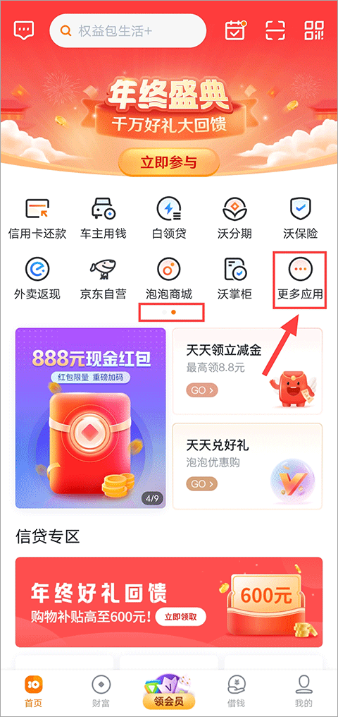 1、打开沃钱包app,进到首页后,将功能服务滑到第二页,点击“更多应用”