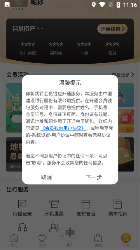 1、打开会员-钱包-银行卡管理。