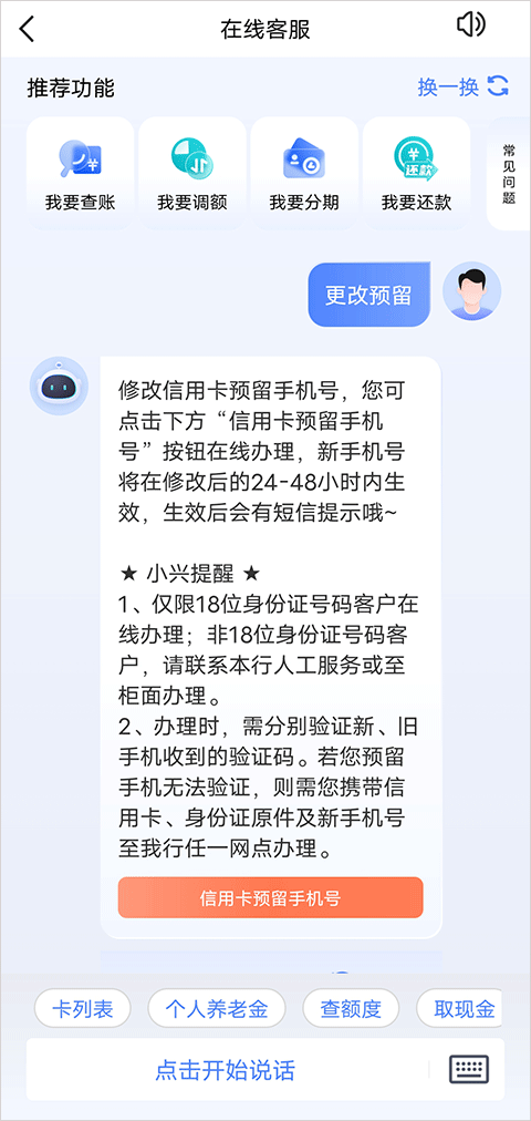 通过点击我的页面右上角的“在线客服”咨询,然后客服发送过来的“信用卡预留手机号”按钮即可在线办理,新手机号将在修改后的24-48小时内生效,生效后会有短信提示哦~