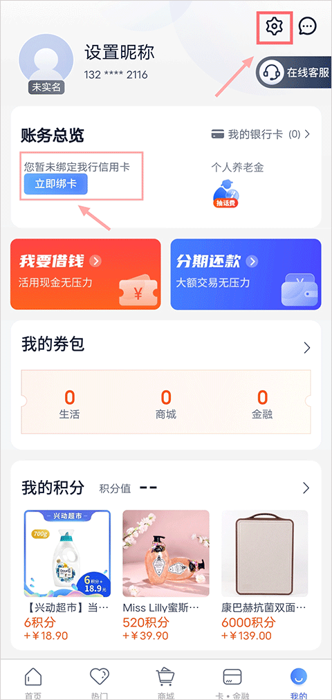 注:也可在我的页面点击“立即绑定”直接绑定信用卡。