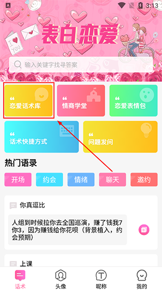 1、进入土味情话恋爱话术app,点击首页的【恋爱话术库】