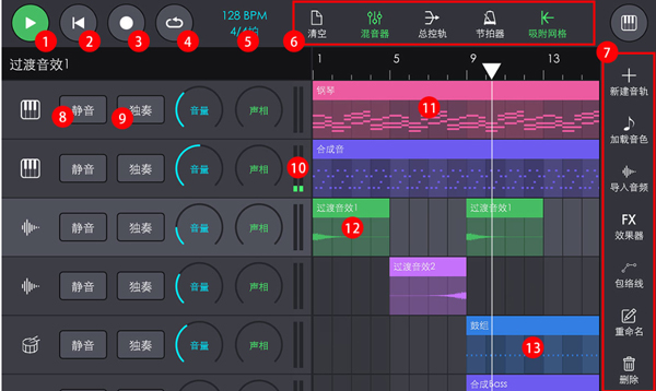 1、点击左侧的鼓按钮可预览鼓音色,长按可对该鼓轨进行加载音色、导入音频、调整音量声相和删除的操作