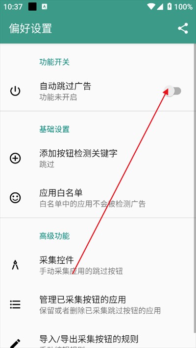 6、打开开启自动跳过广告就可以了,还可以添加按钮关键词跳过哦