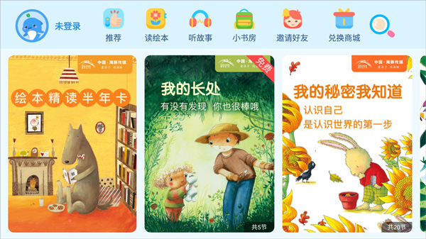 1、打开海豚绘本阅读app,进入首页用户可以注册登录,查看推荐阅读的绘本故事;