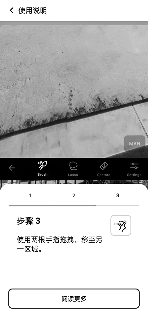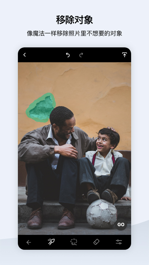 3、画笔涂抹之后,在选择第三个橡皮功能,对水印周边画笔的范围进行修饰,修饰完毕之后点击界面中出现的”GO”按钮