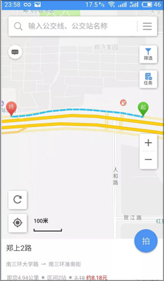 3、点击【筛选】,选择【公交线】【普通】,就会出现公交线拍摄的任务;再点击地图中的小标志,就会出现公交线具体任务信息及奖金奖励;