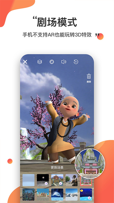 用户可以打开AR摄像头,通过简单的操作,将AR模型放在真实世界中,创造各种神奇的景象,用AR就能创造电影里才能出现的特技。