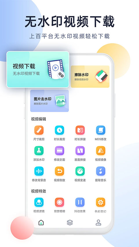 另外全新的强力视频去水印软件还有强大的视频编辑、视频滤镜特效等丰富的功能,各种功能一目了然,轻松操作即可体验,智能且人性化的设计,包您耳目一新,眼前一亮,分分钟让你的视频有趣起来,页面干净简洁,功能快捷且方便,快来下载试试吧。