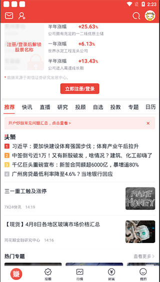1、打开财富乐赚手机版,在首页可以看到很多证券信息;