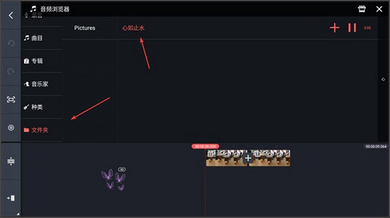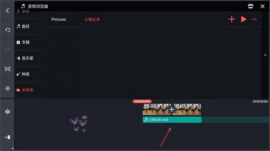 3、无论哪种,只要找到自己喜欢的也音乐,点击右侧的+符号,就可以将音频文件导入视频