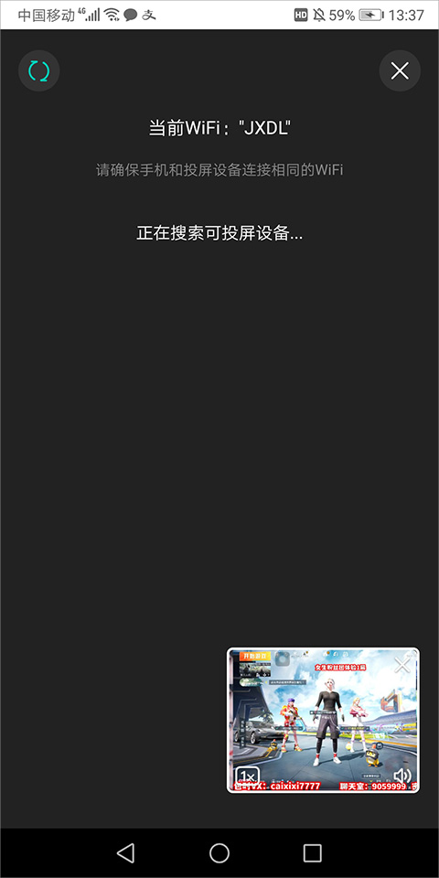 2、点击投屏图标后,就会自动搜索出与手机在同一个wifi环境下的投屏设备进行投屏