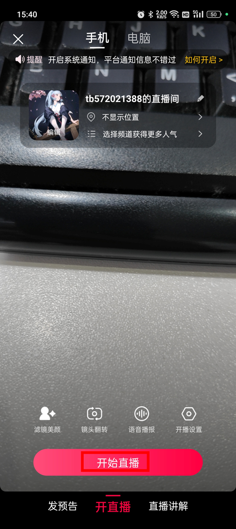 2、进入到直播开启页面之后,设置好标题头像之后,直接点击下方红色的开始直播;