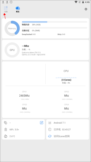 进入首页,我们可以很直观的查看到各种手机数据,可以看到我们手机的内存使用情况、系统进程、CPU占用、各个核心情况等等。