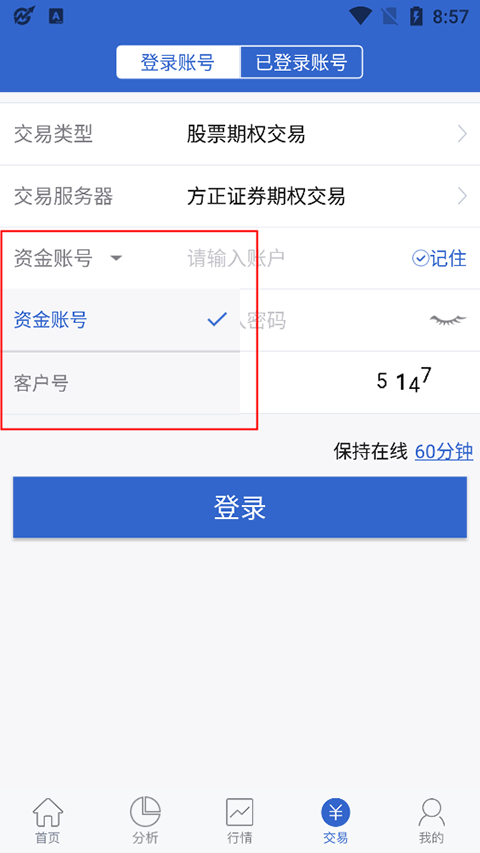 由于小方期权app上只能进行资金账号登录,这里的资金账号就是指在方正证券公司或其它证券公司中开户的资金账号。而这里的客户号并不是指上海证券交易所或深圳证券交易所的股票账号(这种账号也可以进行期权交易),而是对于没有满足期权开户条件的个人投资者可以使用别人的资金账号进行交易,这种也被称之为分仓交易。期权分仓除了不能进行行权和备兑开仓之外,是满足基本的日常交易需求的,有买入开仓、卖出平仓,卖出开仓、买入平仓,能够作为买卖方进行交易。
