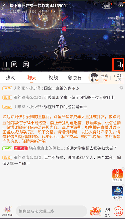 2、在直播房间中可以点击屏幕来发现任务栏,点击任务栏上的横屏模式;