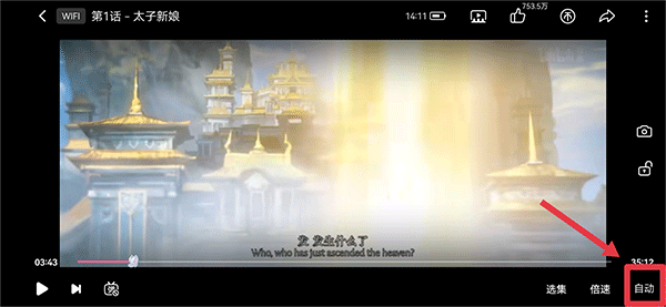 1、首先将播放界面切换为全屏模式,然后点击屏幕唤醒菜单功能,并点击右下角自动