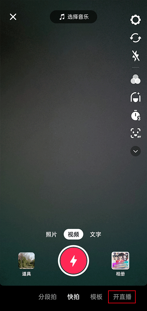 2、切换到拍摄页面之后,点击页面右下角位置的【开直播】;