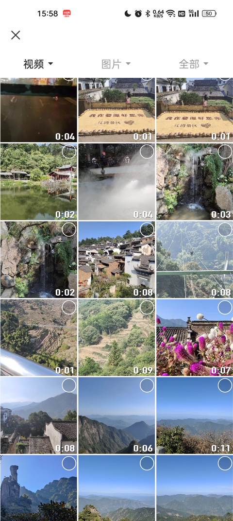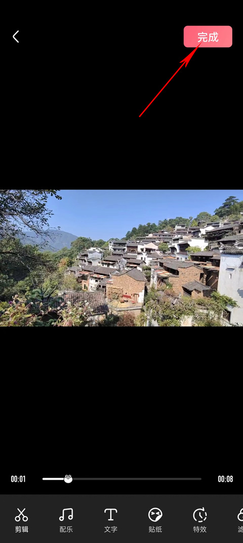 3、选择好你需要添加的视频之后,对视频进行剪辑、配乐、添加文字、添加贴纸、特效等操作,编辑好后点击右上方的完成。