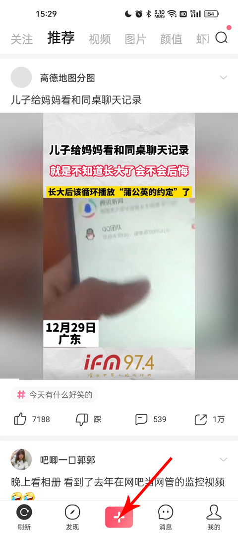 2、首页有推荐、视频和图文三个频道,右上角的搜索按钮可以搜索热门标签话题,其中包括美食、宠物、电影、热血动漫、恶搞等话题。