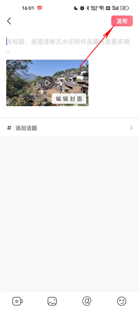 4、添加之后,编辑你需要发布的内容,添加相应的话题,最后点击右上角的发布即可。