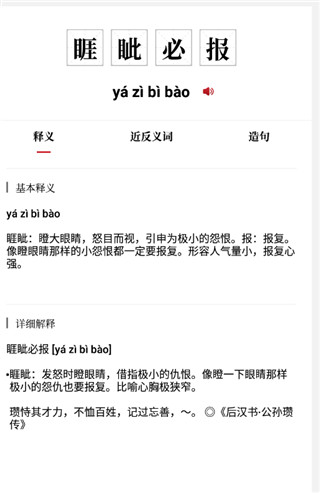 3、在查询结果中,用户点击喇叭富豪,软件就会给用户提供标准的成语发音,用户可以实现跟读,纠正错误读法