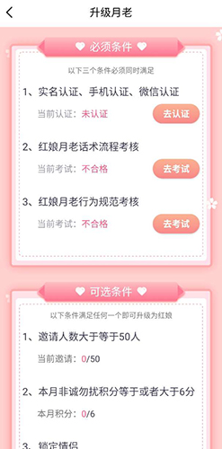 满足条件就可以升级为红娘了:邀请人数大于等于50,本月非诚勿扰积分大于等于6分,最后一个就是锁定情侣状态。