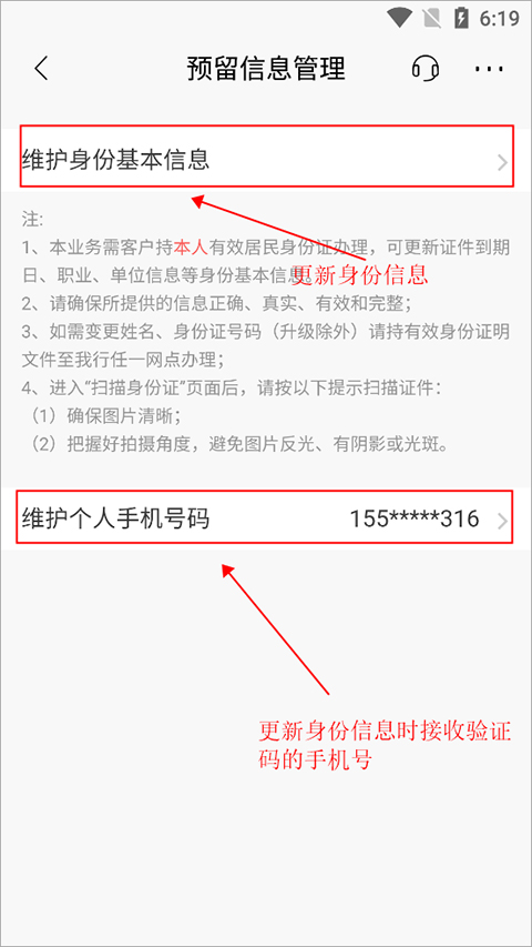4、如图所示,可以看见”维护身份基本信息“(用来更新身份信息)以及”维护个人手机号码“(更新身份信息时接受验证码的手机号)我们选择”维护身份基本信息“点击进入即可